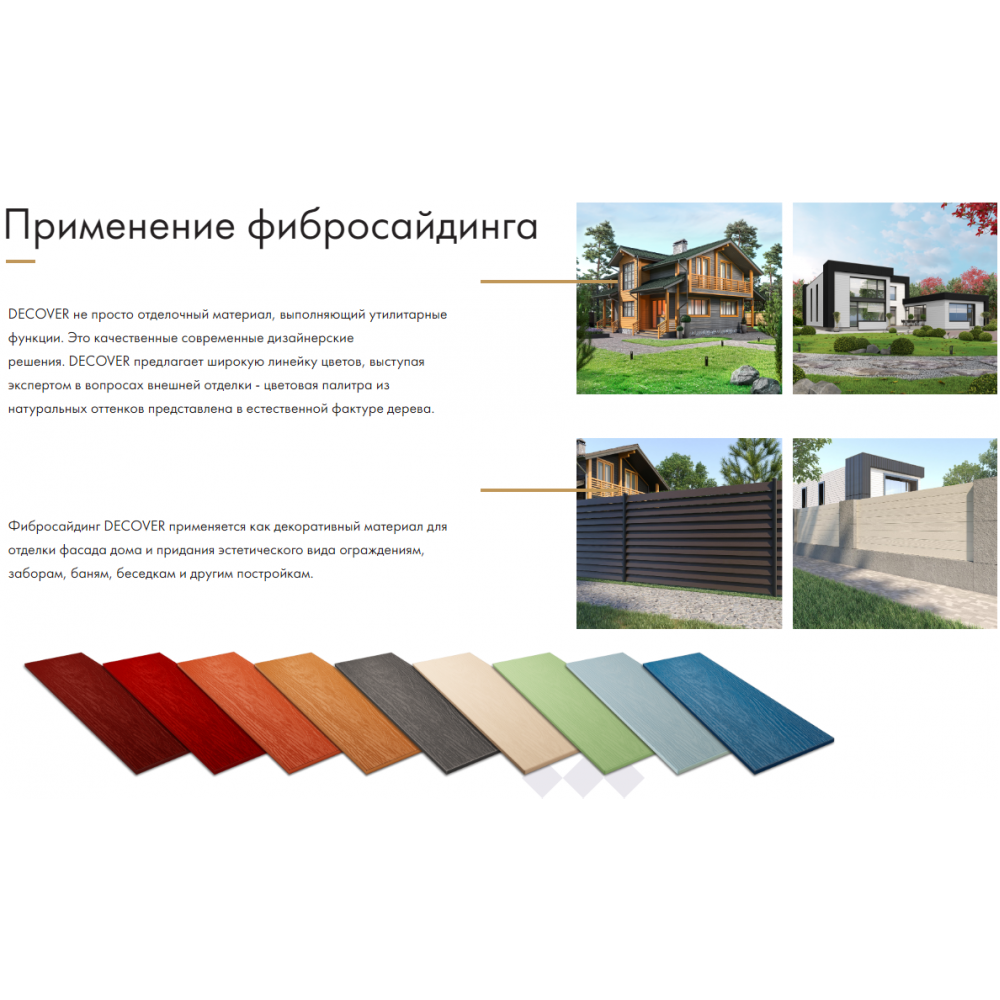 Доп.Инфо: Фиброцементные панели Decover применяются для коттеджного и малоэтажного строительства, обновления многоквартирных домов и административных зданий, придания эстетического вида беседкам, баням и другим постройкам