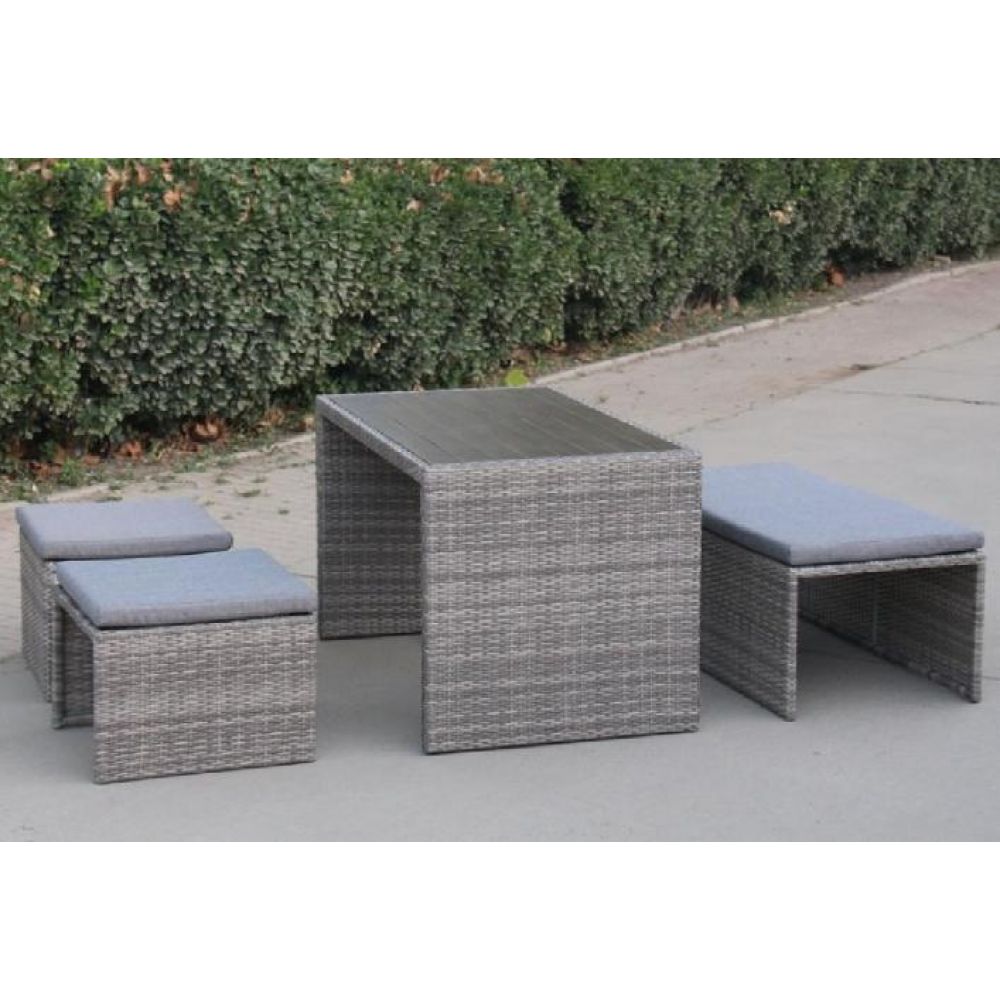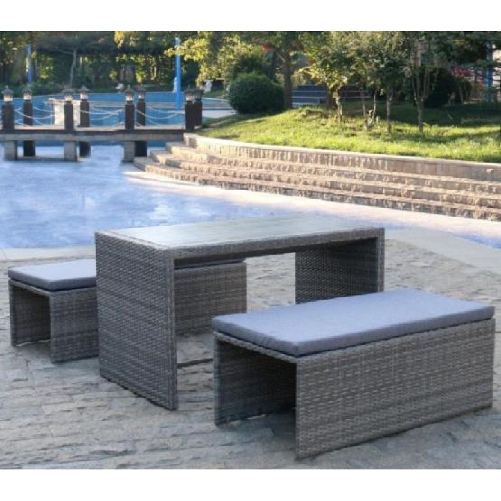 - Доп. инфо: В составе комплекта: диван, который трансформируется в обеденную группу: стол, лавочка и 2 пуфа. Высококачественная лоза из полиротанга серого цвета стойкая к любым атмосферным явлениям. Крепкий стальной каркас с полимерным антивандальным покрытием и отличным качеством сварки.
